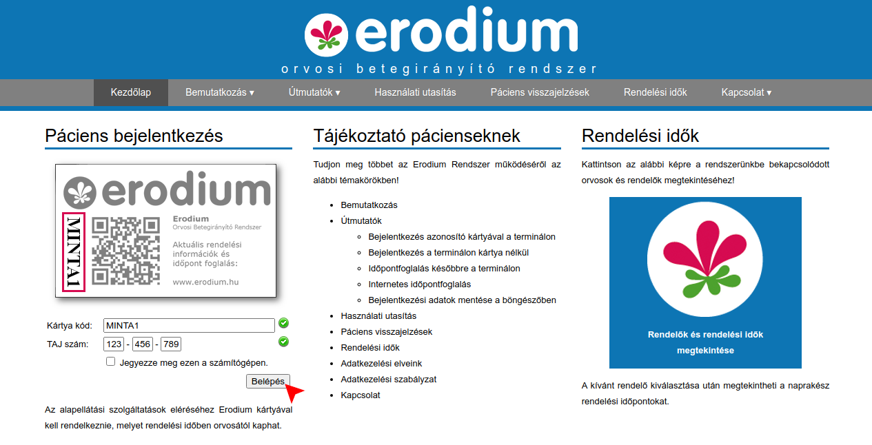 A webes felületen történő időpontfoglaláshoz rendelkeznie kell az orvosától kapott azonosító kártyával. A foglaláshoz egyrészt szükséges a kártya kódja, másrészt biztonsági okokból szükség van az Ön TAJ számára. Első lépéseként rendszerünk weboldalának (www.erodium.hu) kezdőlapján válassza a Pácienseknek (Rendelési idők és időpontfoglalás) lehetőséget. Ennek hatására megjelenik a regisztrált páciensek bejelentkező felülete.