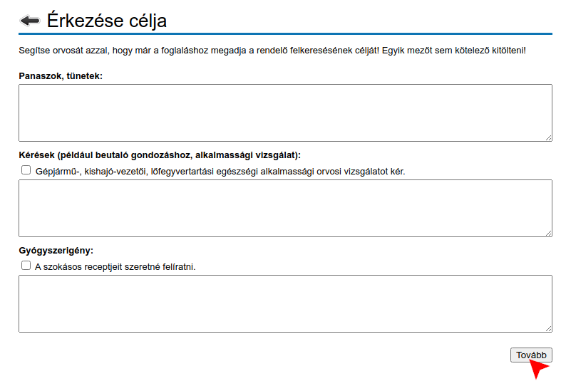 A megjelenő űrlapban előre jelezheti orvosa számára az időpontfoglalás célját, hogy a rendelőben már az Ön érkezése előtt elő tudjanak készülni a lehető leggyorsabb ellátás érdekében. Egyetlen mező kitöltése sem kötelező. A Tovább gombra kattintva léphet tovább.