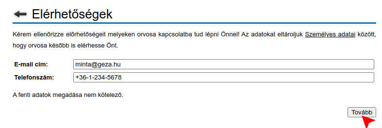 A következő oldalon megadhatja e-mail címét és telefonszámát. Ezeket orvosa a foglalással kapcsolatos probléma vagy kérdés esetén használhatja az Ön elérésére. Megadásuk nem kötelező. A tovább gombra kattintva léphet tovább.