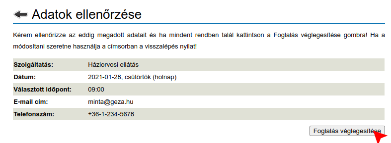Az adatok ellenőrzése képernyő összefoglalja az Ön által választott időpont részleteit valamint megjeleníti az Ön által megadott adatokat. Ha mindent rendben talál akkor a Foglalás véglegesítése gombbal tudja a foglalási folyamatot lezárni.